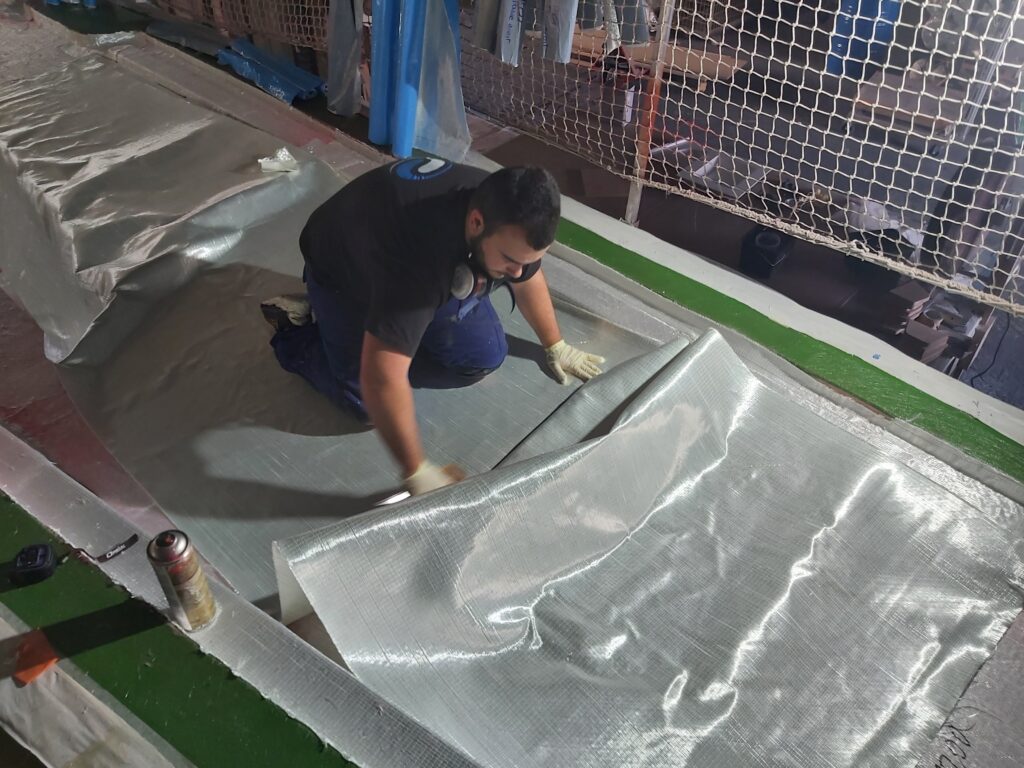 Après avoir gelcoaté le moule au pistolet, on place les renforts en fibre: c’est le drapage.